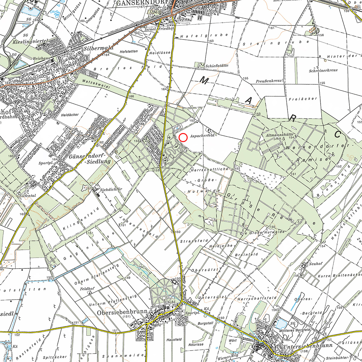 über der Trasse der zukünftigen S8 bei Parbasdorf, zwischen L6 und Marchfeldkanal, 10. 3. 2018 es finden gerade archäologische Vorerkundungen statt da dieses Gebiet Schlachtfeld in den Napoleonkriegen war. interaktive Darstellung |