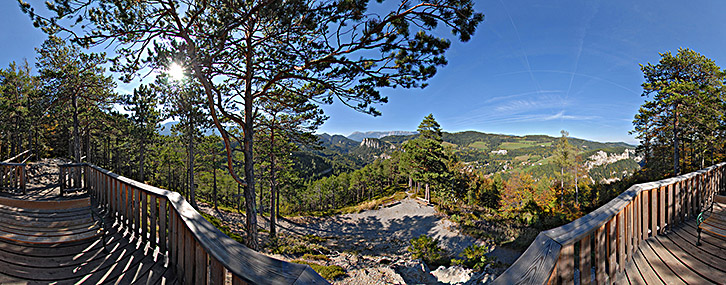 Blick von der Doppelreiterwarte auf die Semmeringbahn und den Ort Breitenstein. Im Hintergrund links die Raxalpe und in der Mitte der Schneeberg, 11. 10. 2006