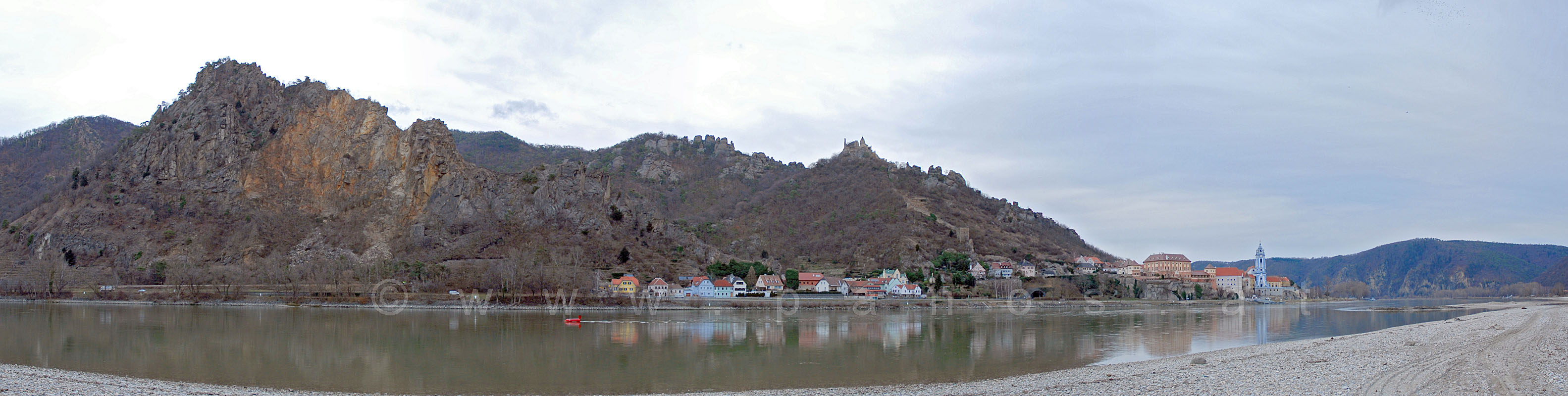 Dürnstein von Rossatzbach Strand bei Fähre aus gesehen (Probefoto), 11. 1. 2007