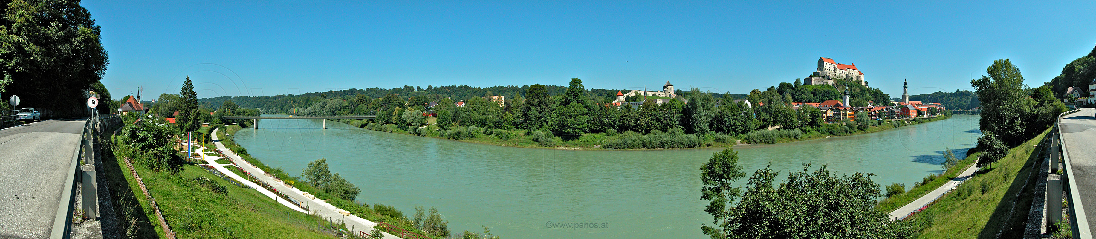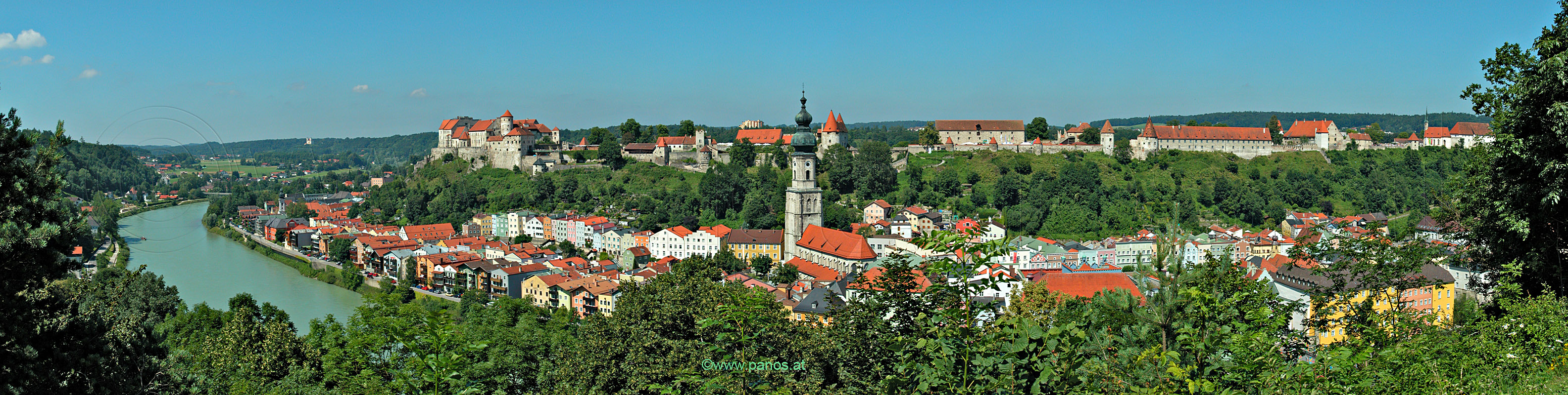 Burghausen, Rundblick vom Dach der Hauptburg, 16. 7. 2004 13841 x 2665 = 37 MegaPixel, Fotogröße 352 x 68 cm bei 100ppi interaktives Bild mit Quicktime oder Flash