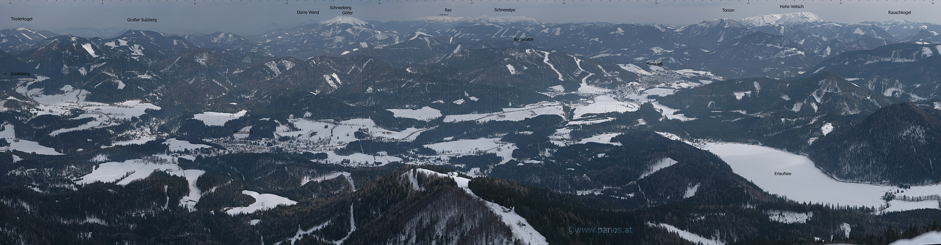 Blick Richtung Mariazell vom Gipfel der Gemeindealpe, 21. 3. 2006 Großformat-Foto: 68122 x 17736 Pixel = 1,2 Gigapixel, Fotogröße 17,3 x 4,5 m bei 100ppi Foto in voller Auflösung