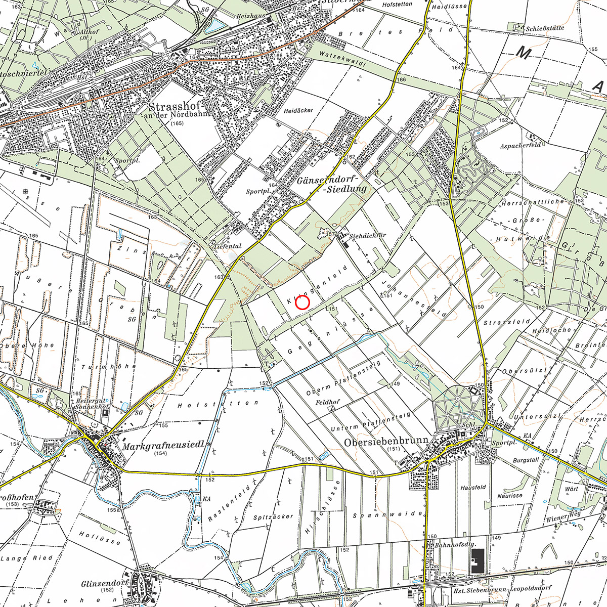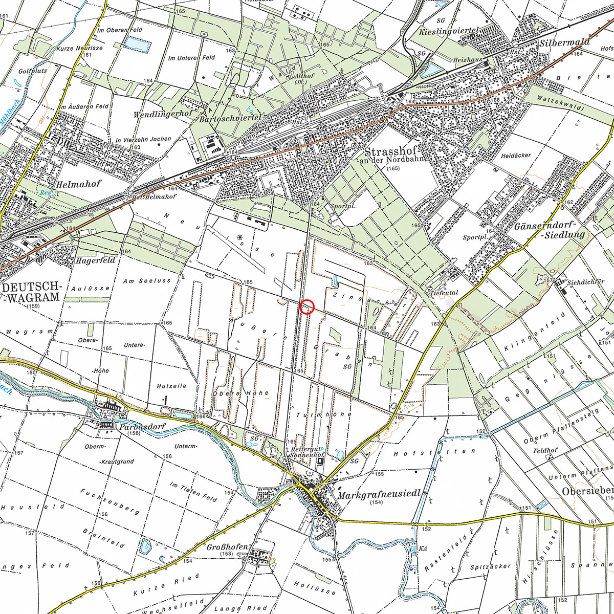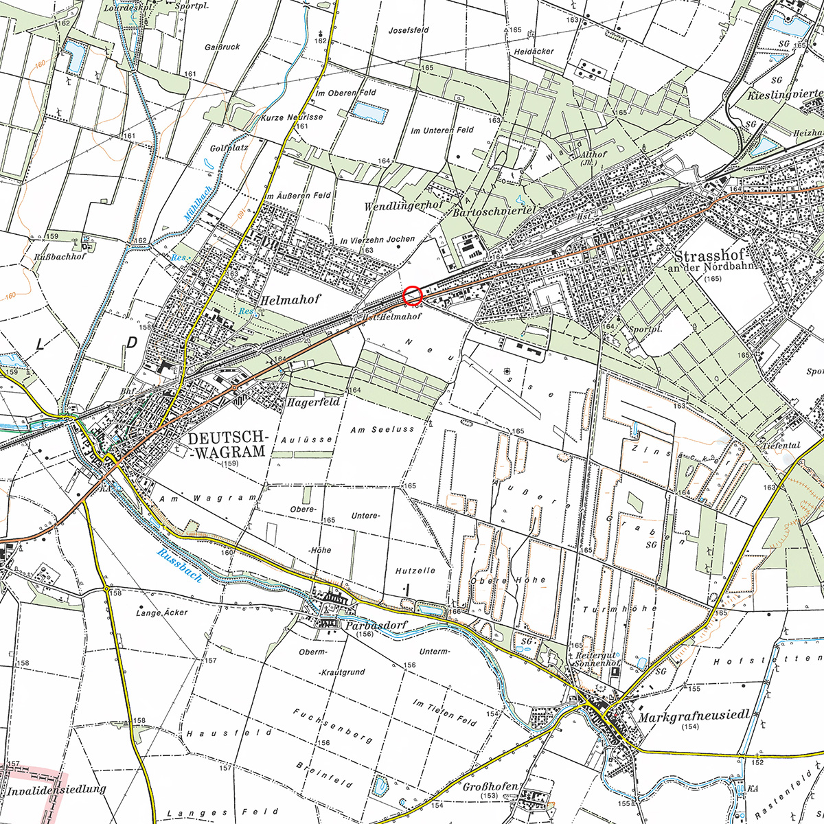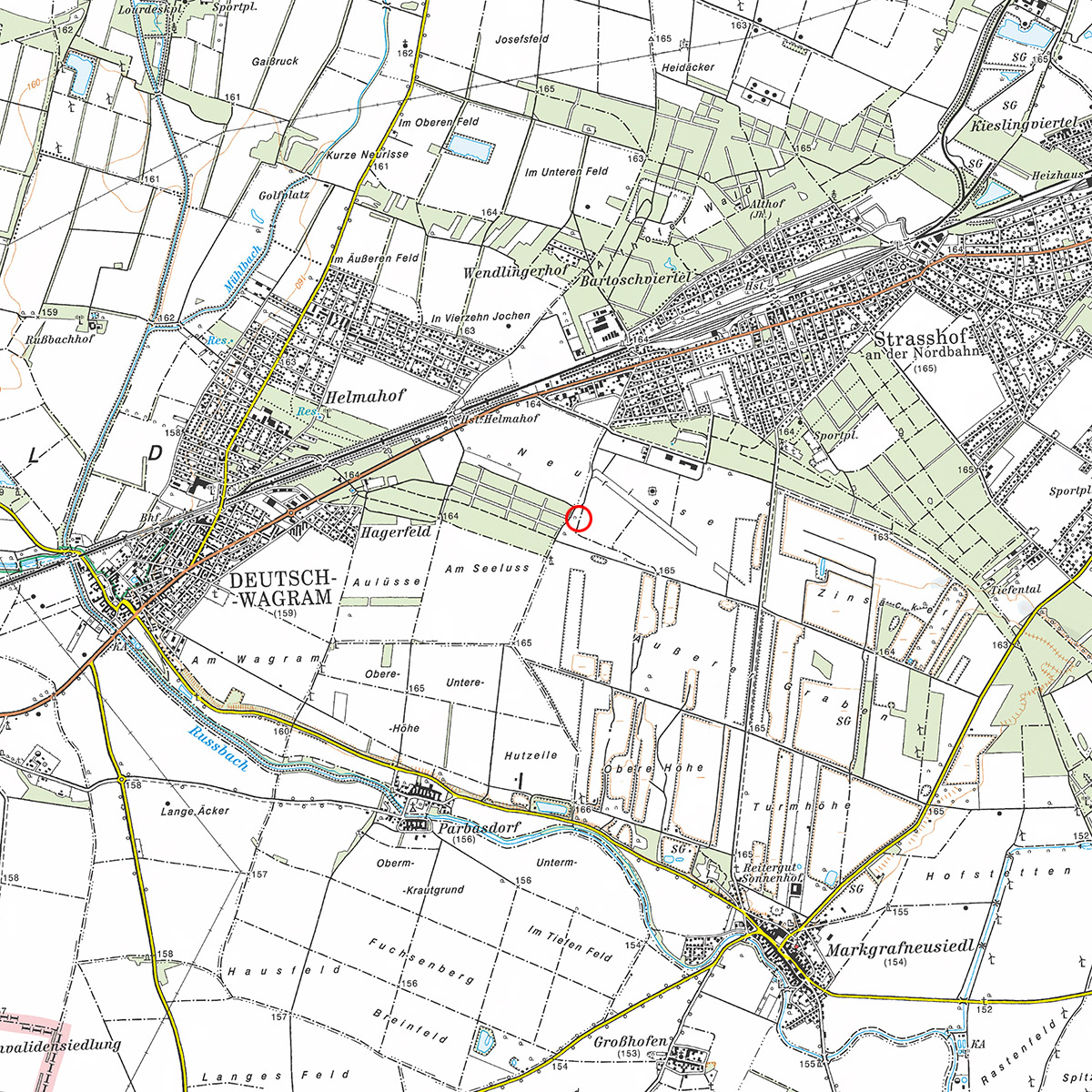 über der Trasse der zukünftigen S8 bei der Kreuzung mit dem Auersthaler Weg, 27. 5. 2018 interaktive Darstellung |