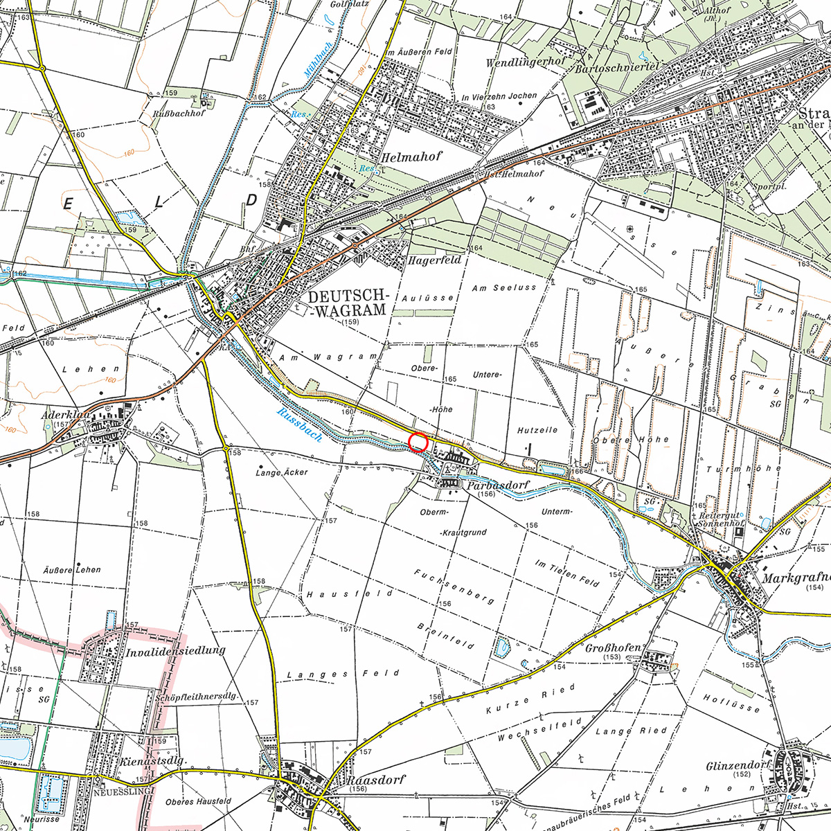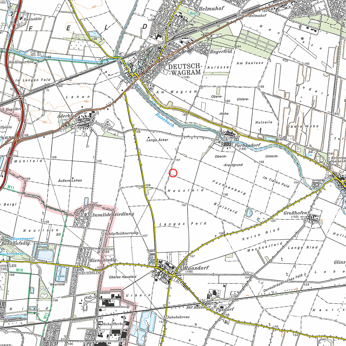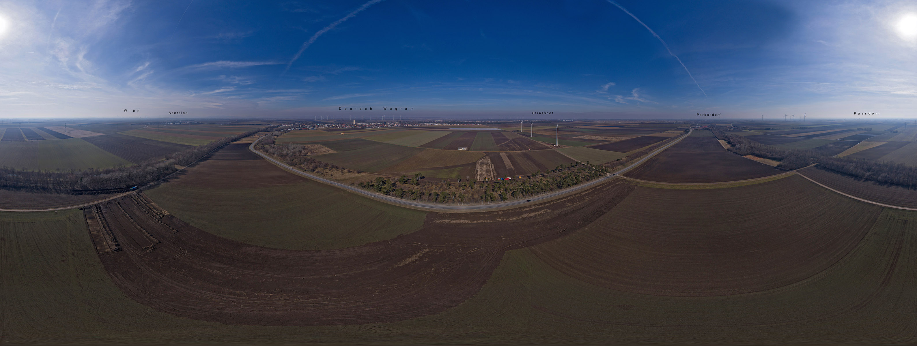 über der Trasse der zukünftigen S8 bei Parbasdorf, zwischen L6 und Marchfeldkanal, 10. 3. 2018 es finden gerade archäologische Vorerkundungen statt da dieses Gebiet Schlachtfeld in den Napoleonkriegen war. interaktive Darstellung |