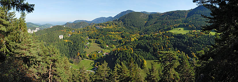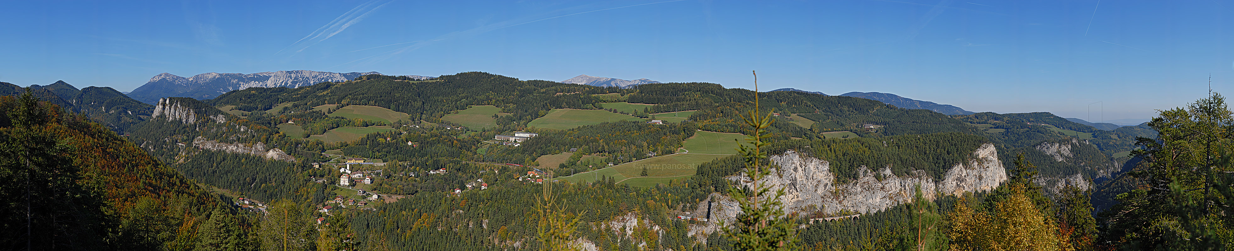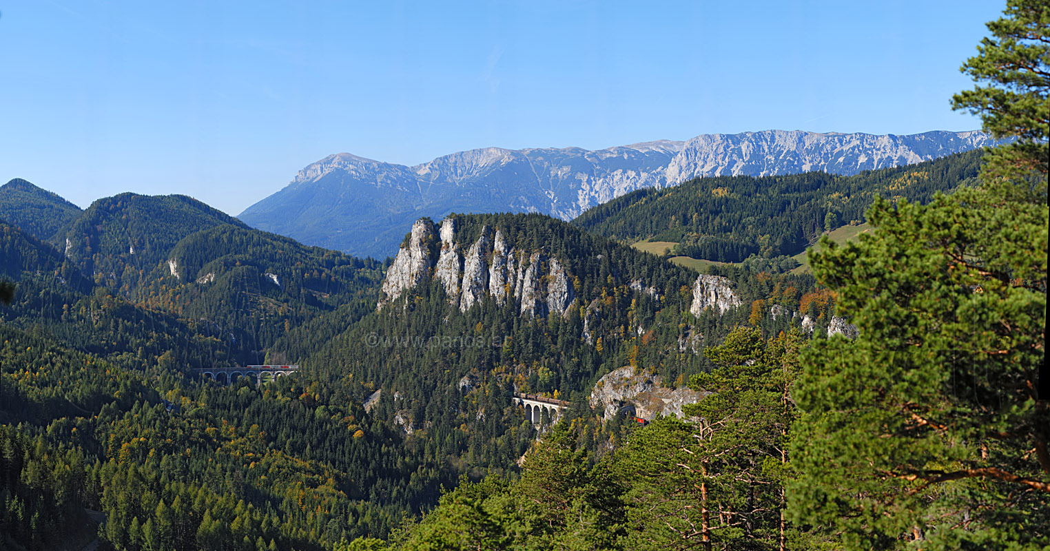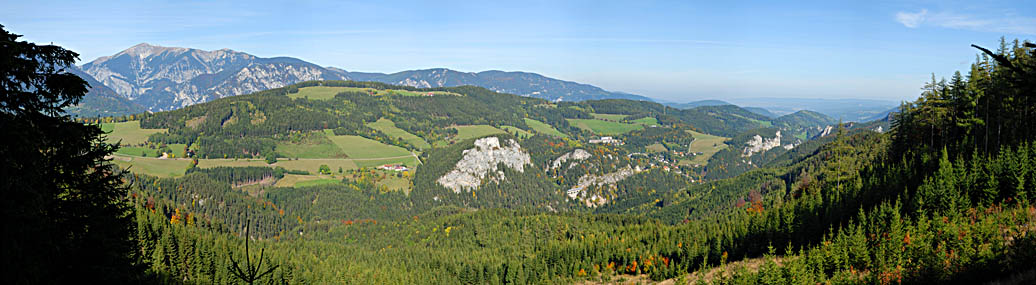 Blick von der Doppelreiterwarte auf die Semmeringbahn und den Ort Breitenstein. Im Hintergrund links die Raxalpe und in der Mitte der Schneeberg, 11. 10. 2006
