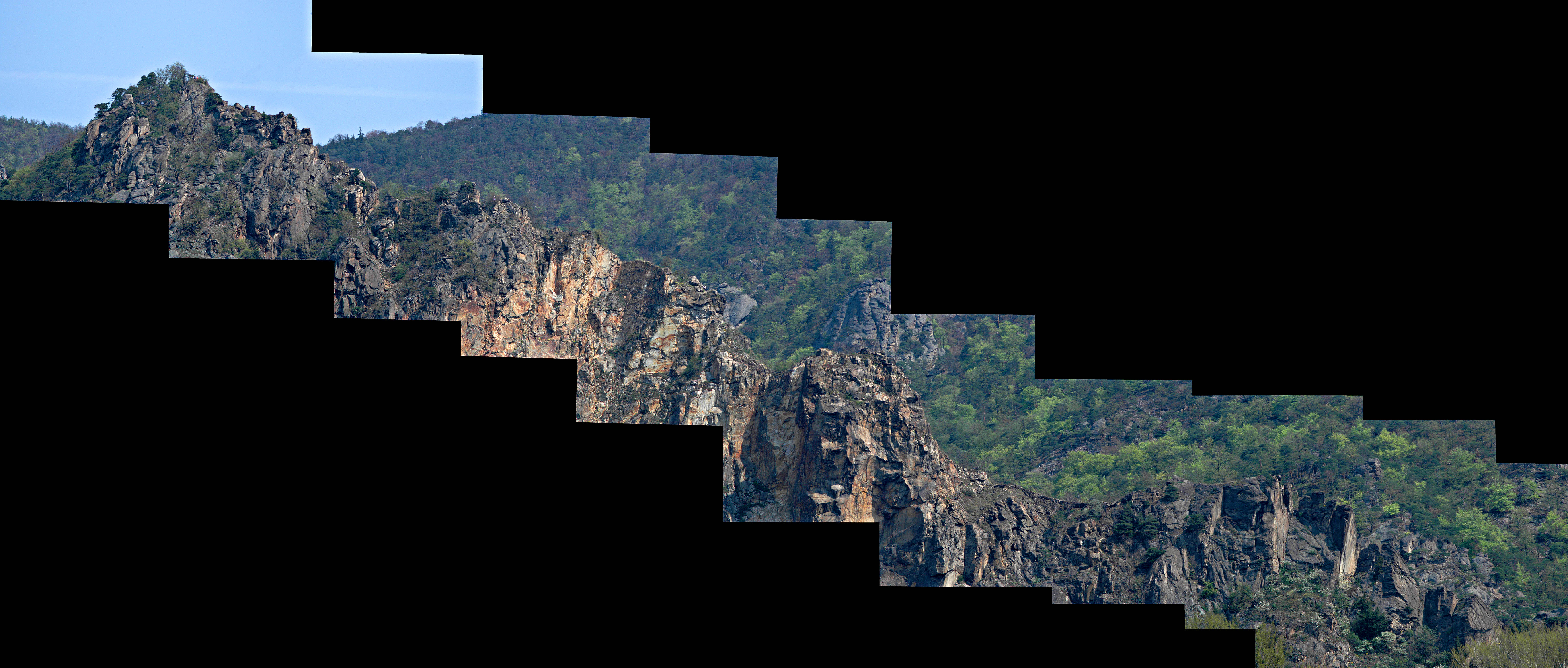 plus: eindeutig besser als vorheriges Pano, Toskanische Villa gerade noch sichtbar, Schlosshotel mit Felsen gut sichtbar