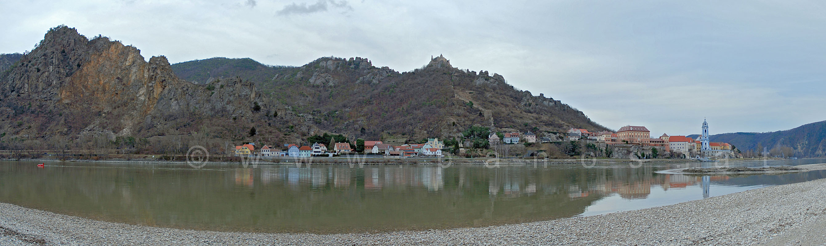 Dürnstein von Rossatzbach Strand bei Fähre aus gesehen (Probefoto), 11. 1. 2007