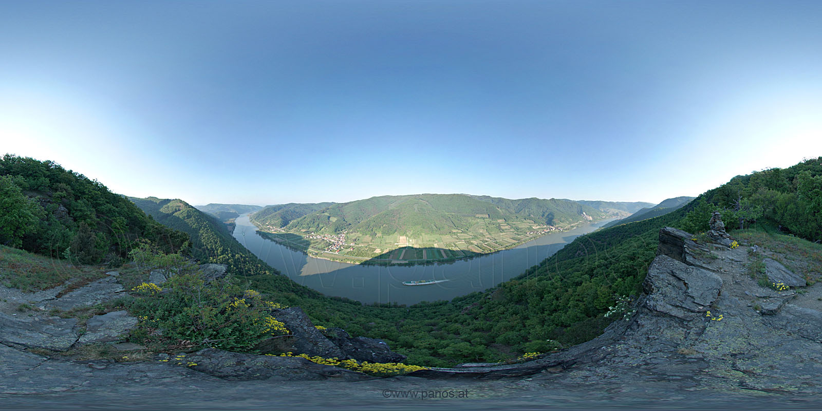 Rundblick vom Tischwandfelsen zur Marillenblüte, 22. 4. 2006 13748 x 2297 Pixel = 32 MegaPixel, Fotogröße 349 x 58 cm bei 100ppi interaktive Darstellung