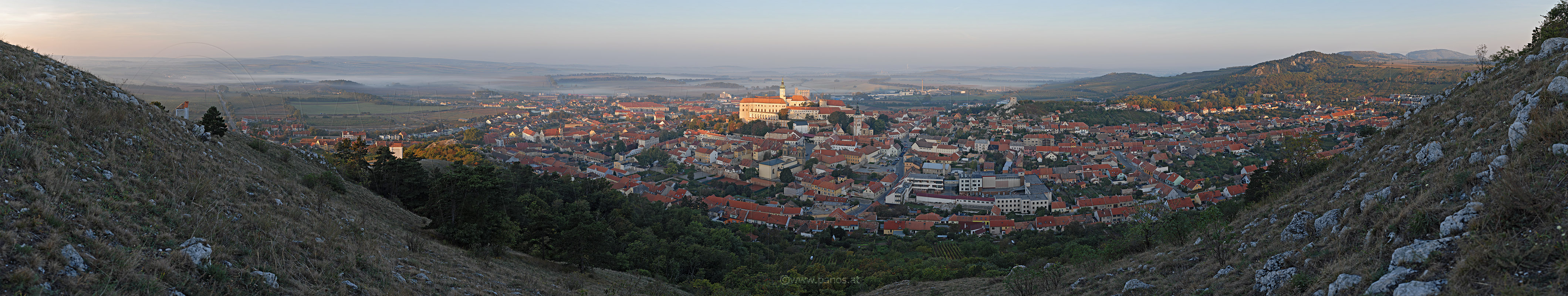 Mikulov vom heiligen Berg Svatý Kopeček aus gesehen, Sonnenaufgang, 10. 10. 2006 Großformat-Foto: 48949 x 9236 Pixel = 452 Megapixel, Fotogröße 12,4 x 2,4 m bei 100ppi Foto in voller Auflösung