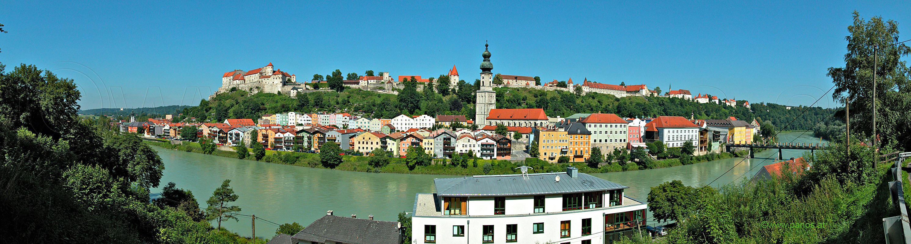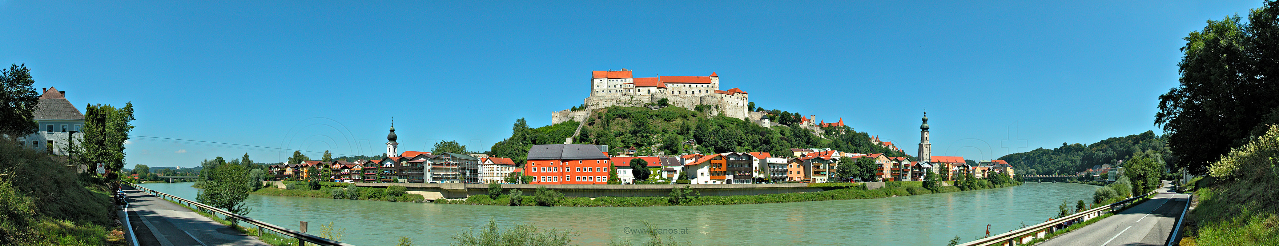 Burghausen, Rundblick vom Dach der Hauptburg, 16. 7. 2004 13841 x 2665 = 37 MegaPixel, Fotogröße 352 x 68 cm bei 100ppi interaktives Bild mit Quicktime oder Flash